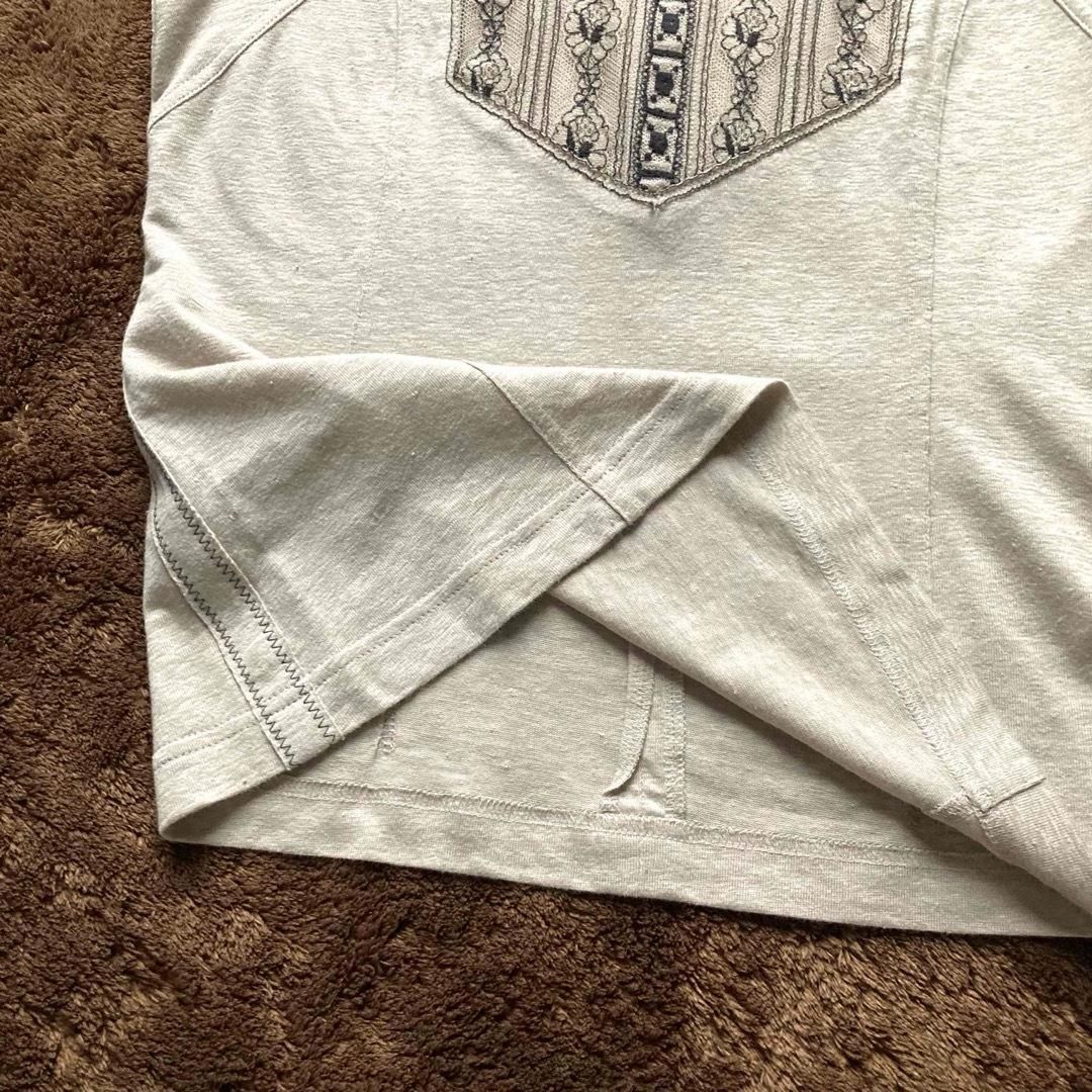 import Rossa インポートロッサ リネン混 ノーカラーブラウス カットソー プルオーバー 胸元レース 刺繍 フリル グレージュ 大きいサイズ 42 NICORILABO_COM