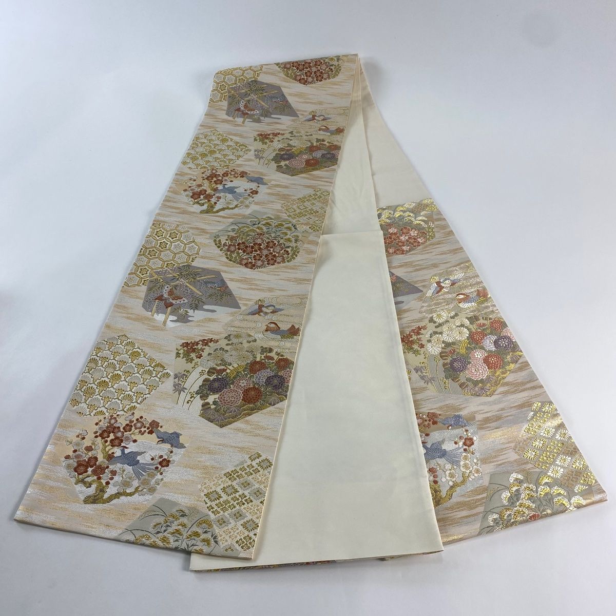 袋帯 秀品 珀鳳絵巻 菊 花青海波 金糸 箔 クリーム 六通 正絹 NICORILABO_COM