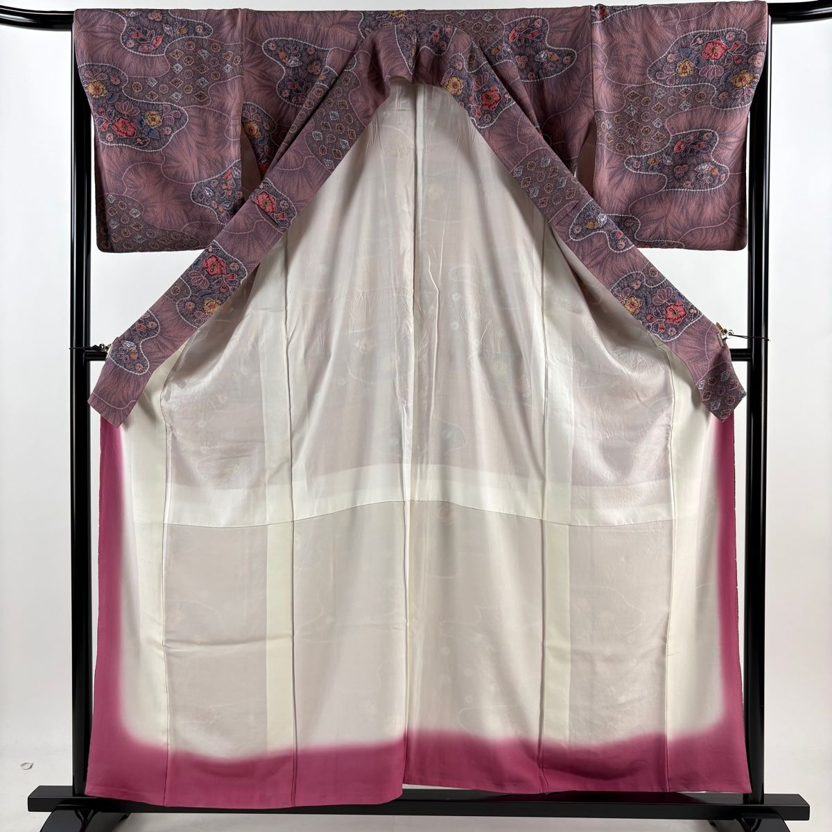 小紋 身丈159cm 裄丈66.5cm M 袷 草花 霞 絞り 縮緬 薄紫 正絹 名品 NICORILABO_COM