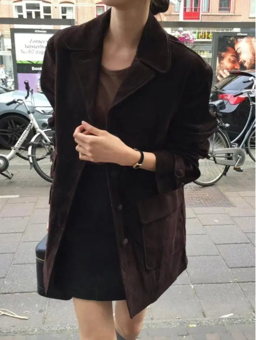ダーク ブラウン カラーで、秋のコーデに良い アウターです。