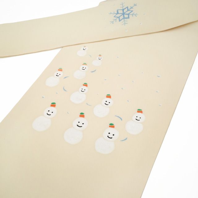 新古品 名古屋帯 ♥ 九寸 正絹 薄卵色地 淡オレンジベージュ かわいい 雪だるま ゆきだるま 手染め 手描き 柄 デザイン お太鼓柄 カジュアル 冬 仕立て上がり みやがわ sb54599 WWW_NICORILABO_COM