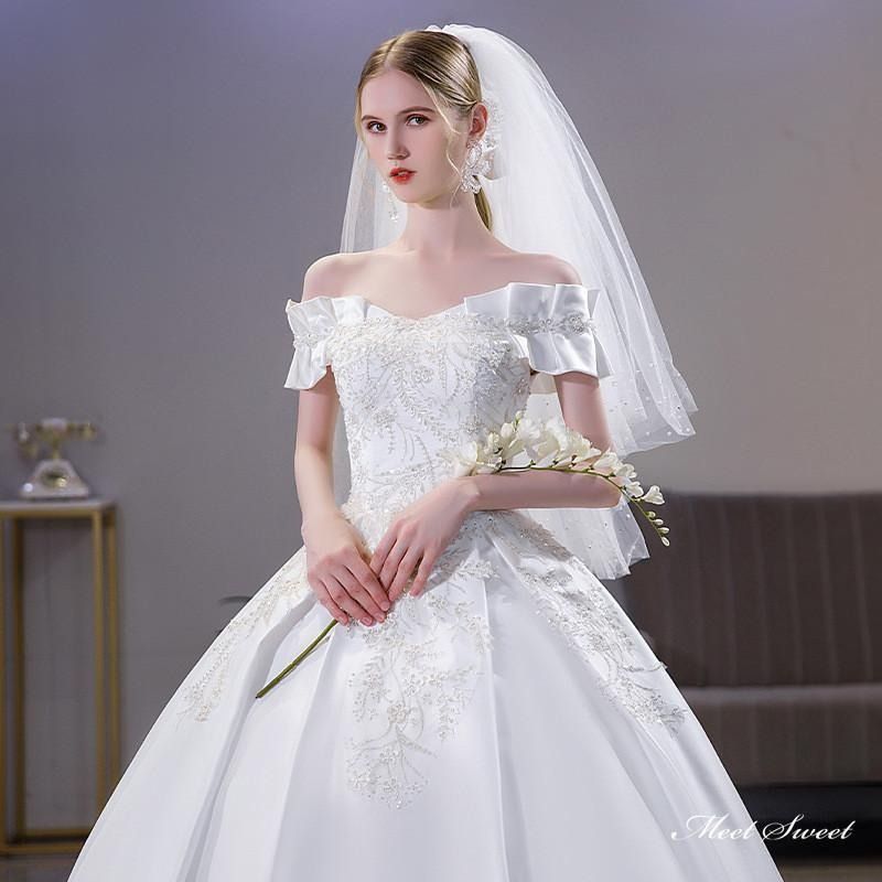 ウェディングドレス ロングドレス プリンセスラインドレス オフショルダー 二次会 結婚式 前撮り 花嫁 ウエディングドレス サテン 海外挙式 ブライダル WWW_NICORILABO_COM