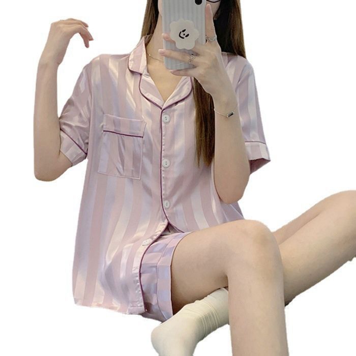 サテンパジャマ ストライプ 冷感 パジャマ ルームウェア レディース 上下セット 半袖 半ズボン 薄手 サテン 夏 やわらか 部屋着 シルクライ WWW_NICORILABO_COM
