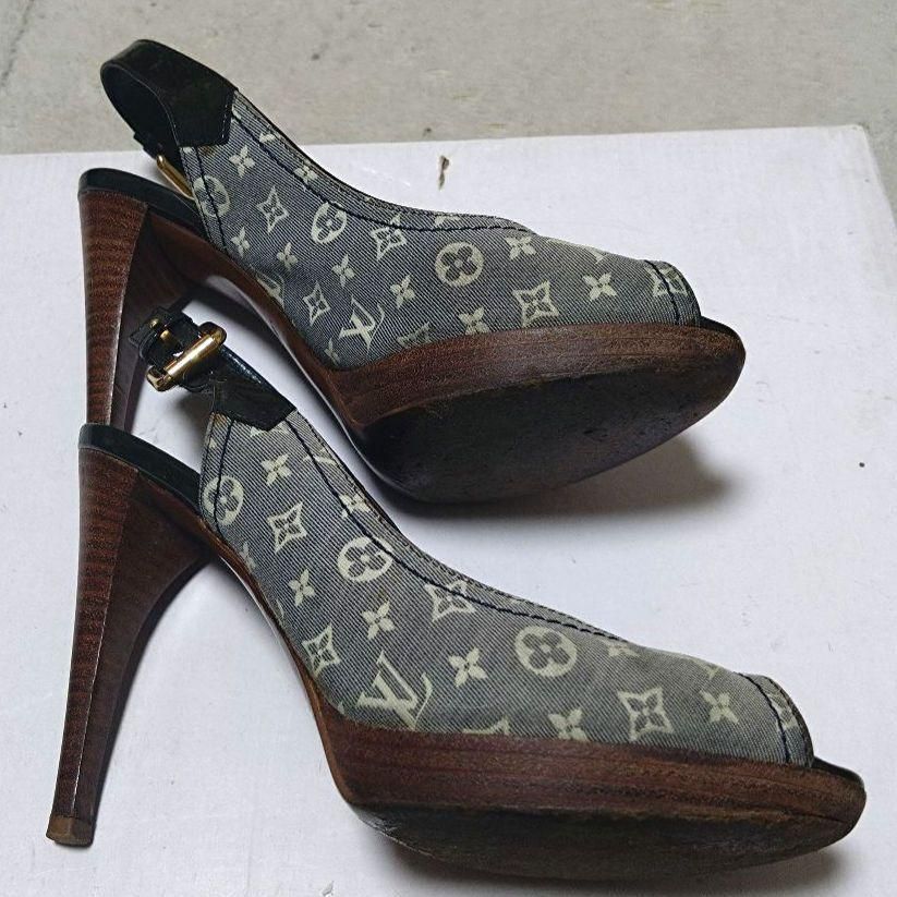 正規品 LOUIS VUITTON ルイヴィトン モノグラム デニム オープントゥ サンダル パンプス 35 22.5cm ハイヒール ピンヒール バックストラップ WWW_NICORILABO_COM
