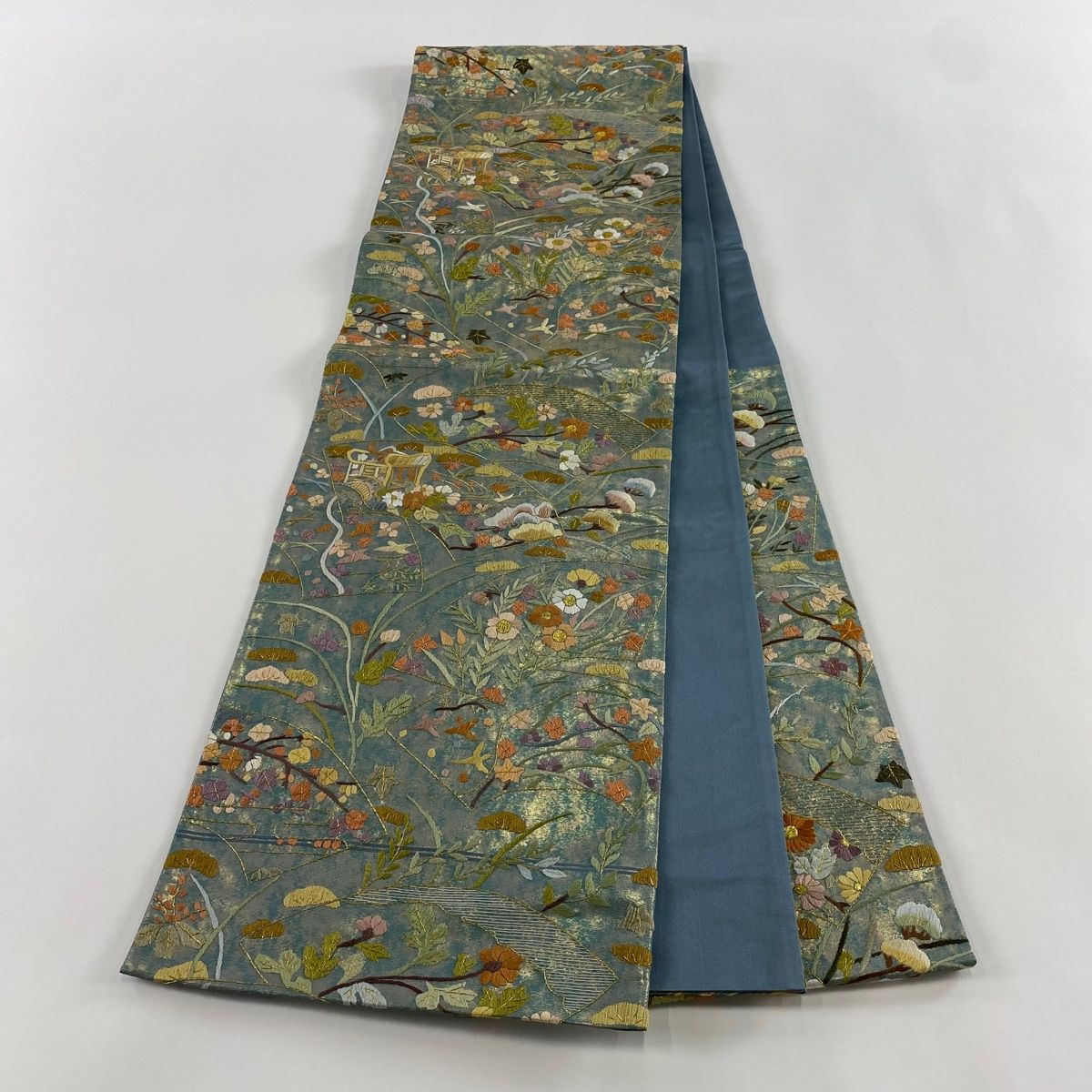 袋帯 草花 御所車 刺繍 箔 青灰色 六通 正絹 WWW_NICORILABO_COM