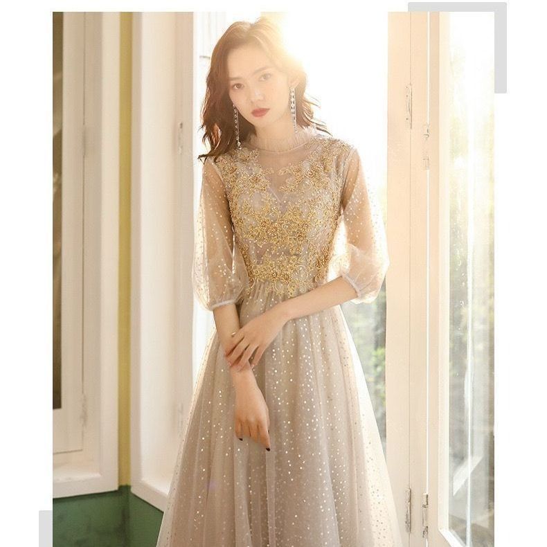 二次会 結婚式 ブライダル ロングドレス サテン 長袖 ラウンドネック シンプル 韓国風 前撮り 海外挙式 花嫁