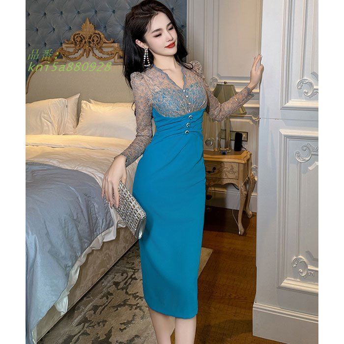 シースルーレース刺繍長袖 膝丈タイトドレスワンピース 水色 結婚式 お呼ばれ パーティー 服 ドレス レディース 韓国 kni5a880928 WWW_NICORILABO_COM