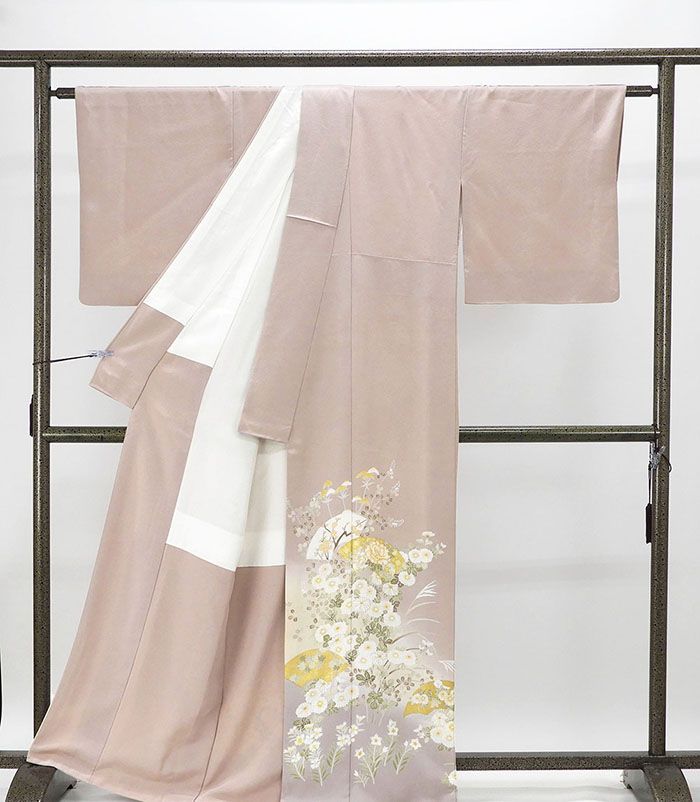 付下げ 身丈161.5cm 裄丈68cm L 単衣 鈴乃屋 雪輪 菊 金彩 金糸 ピンクベージュ 正絹 秀品 一つ紋
