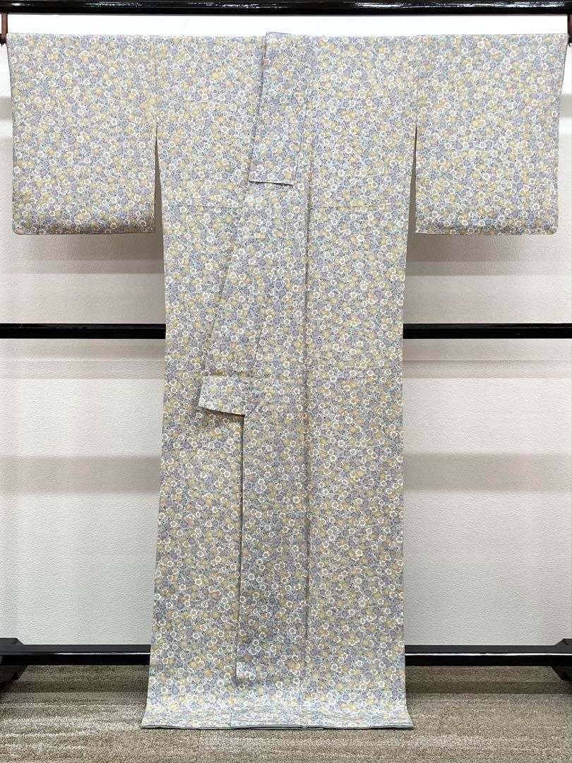 小紋 身丈168cm 裄丈66cm M 袷 加賀友禅 証紙 破れ絵皿 草花 薄黄 正絹 秀品