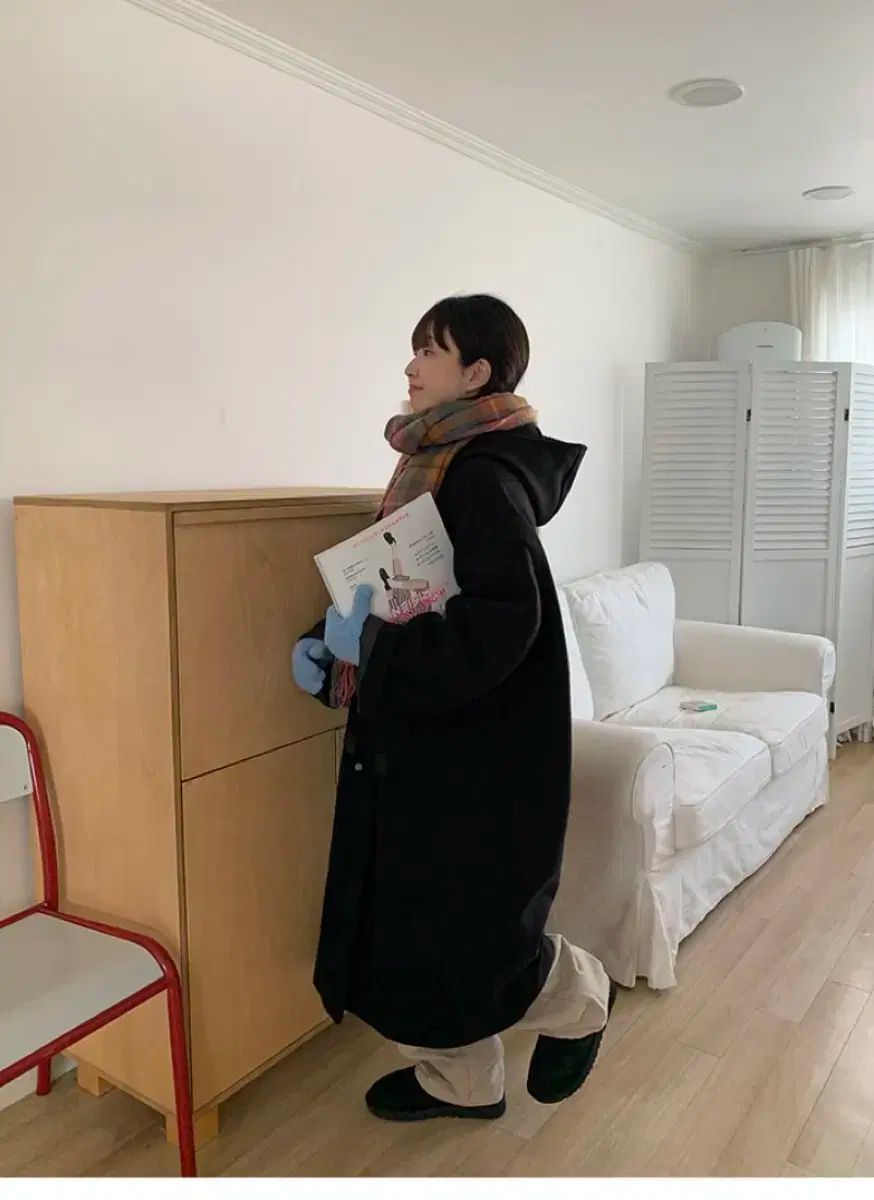 ロング丈でさらっと羽織りやすいです。フードが付いており、トグルボタンで留めるデザインです。