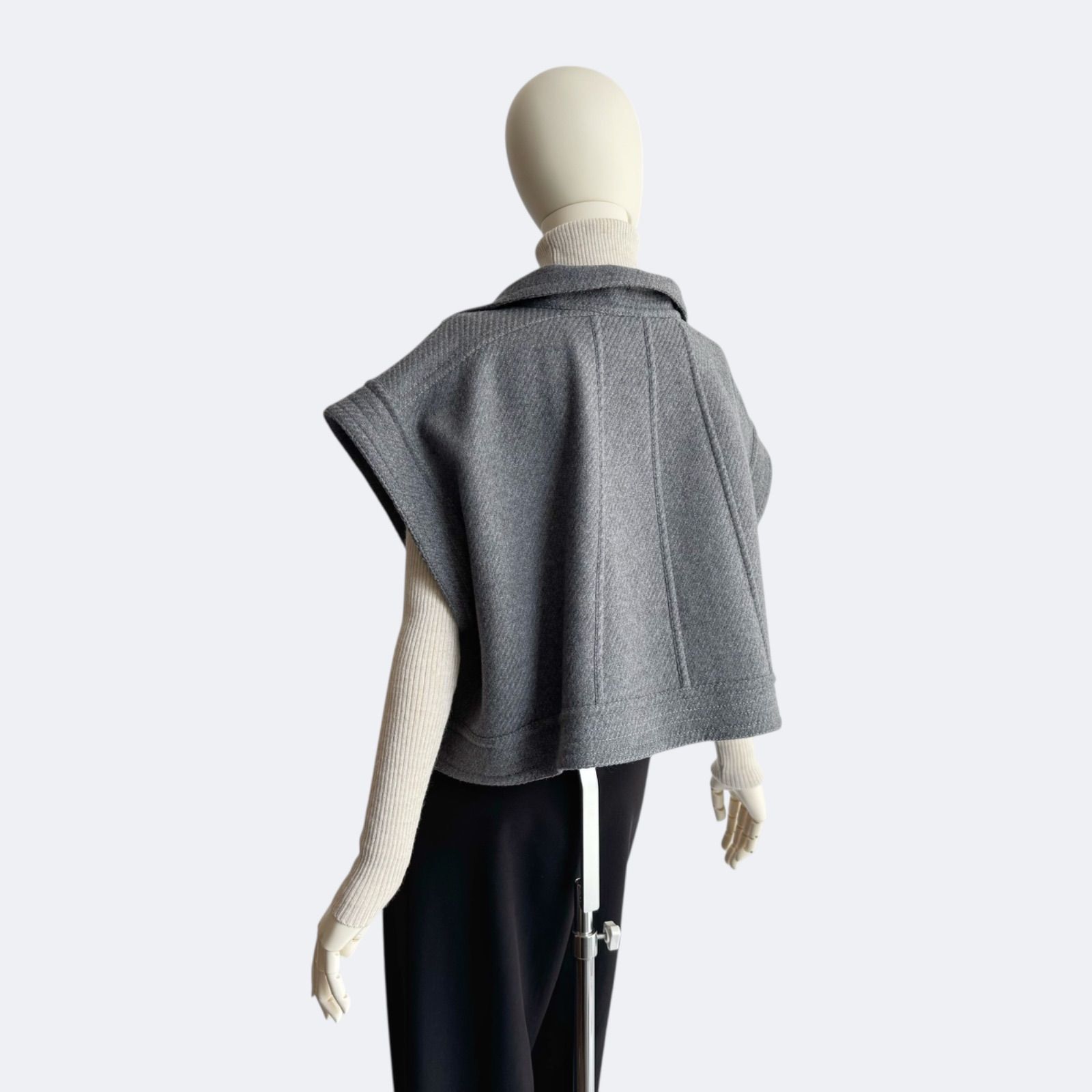 ショート丈×広めのショルダーラインがバランス良く、タートルニットやワンピースとのレイヤードにも最適。
