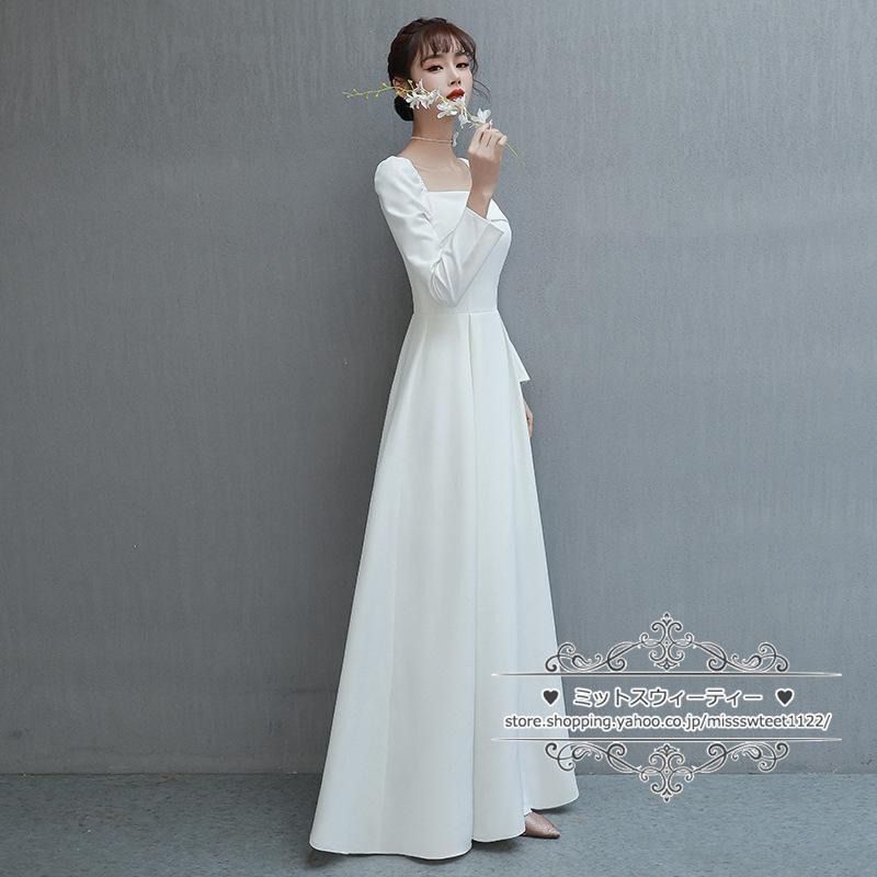 二次会 結婚式 ブライダル ロングドレス サテン 長袖 シンプル ホワイト 前撮り 海外挙式 花嫁 ウエディングドレス 編み上げ パーティー WWW_NICORILABO_COM
