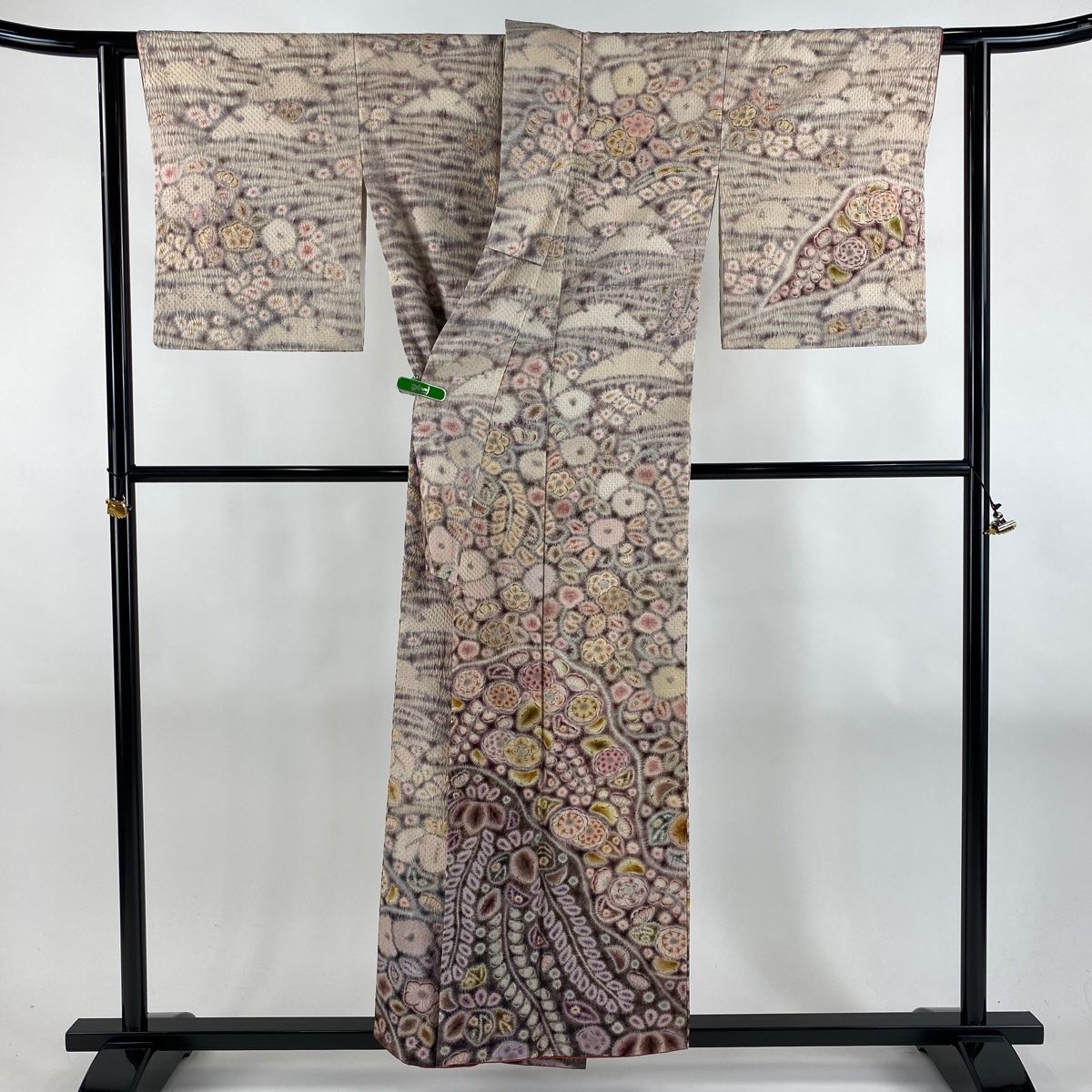訪問着 身丈164.5cm 裄丈65.5cm M 袷 御所車 草花 金彩 灰色 正絹 秀品