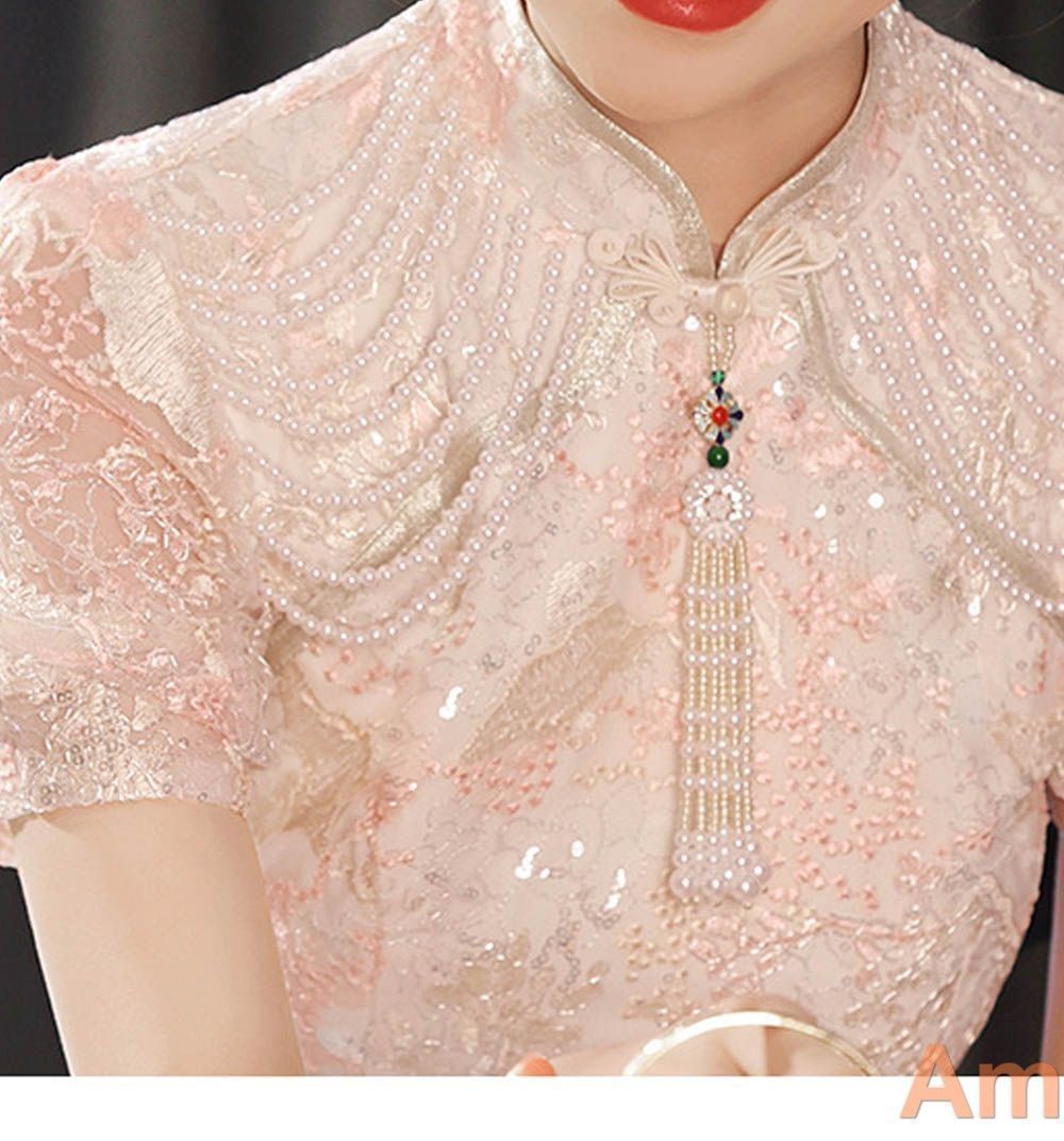 チャイナドレス風ワンピース ブライダル 結婚式 ミモレ丈 半袖 タイト スリット入り レース ビジュー 二次会 チャイナ風ワンピース チャイナドレス ワンピース ピンクの検索結果