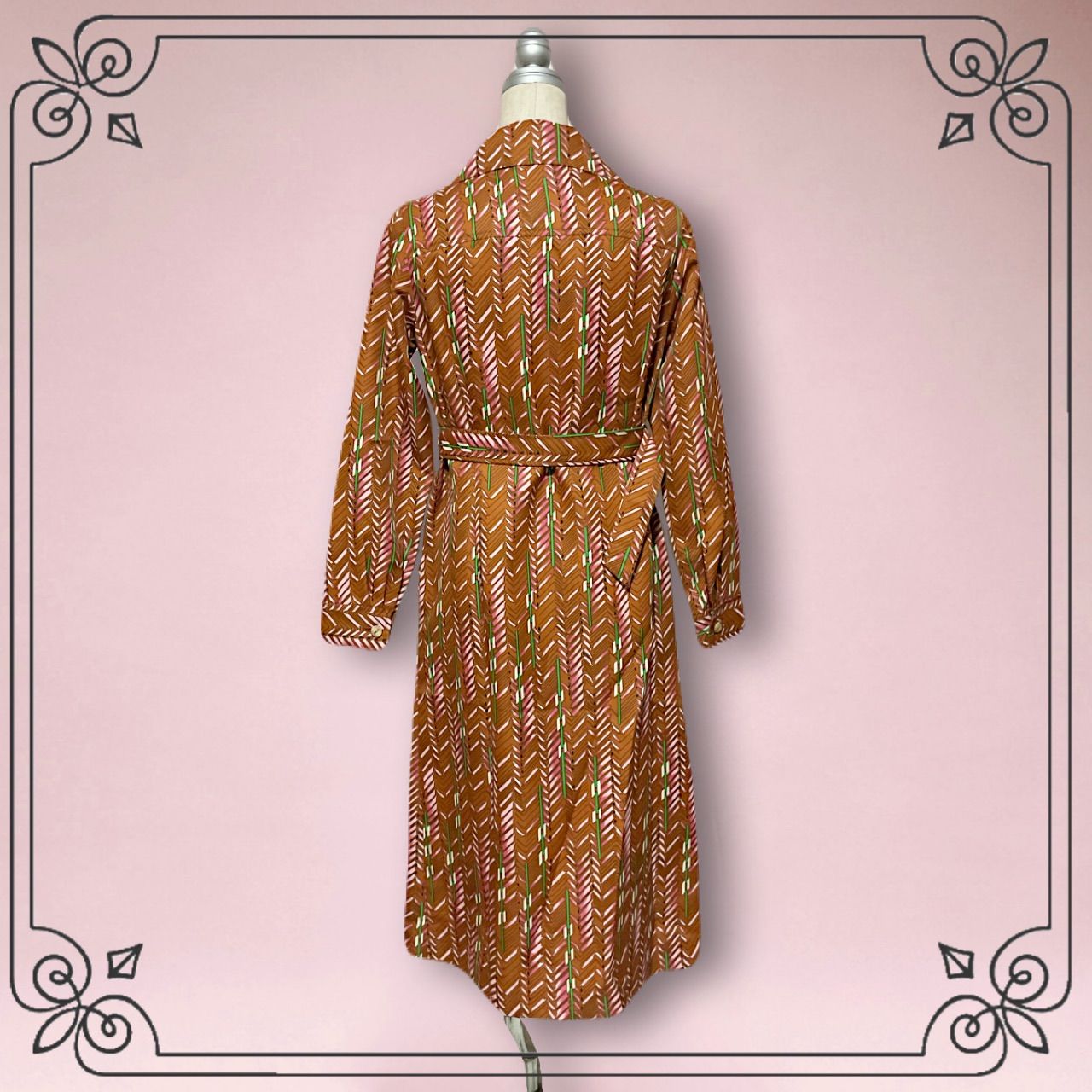 品 ジオメトリック膝丈シャツワンピース 70s レトロ ヴィンテージ 幾何学模様 ドレスコート 大人 ミモレ丈 エレガント モダン 個性派 クラシカル 茶色 Mサイズ WWW_NICORILABO_COM