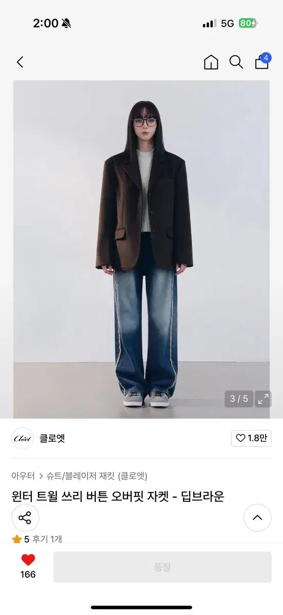 クロエット オーバーサイズ ジャケットです。ディープ ブラウン カラーで、スリー ボタン デザインが特徴です。オーバーサイズで出て、トレンディに コーデし良いです。