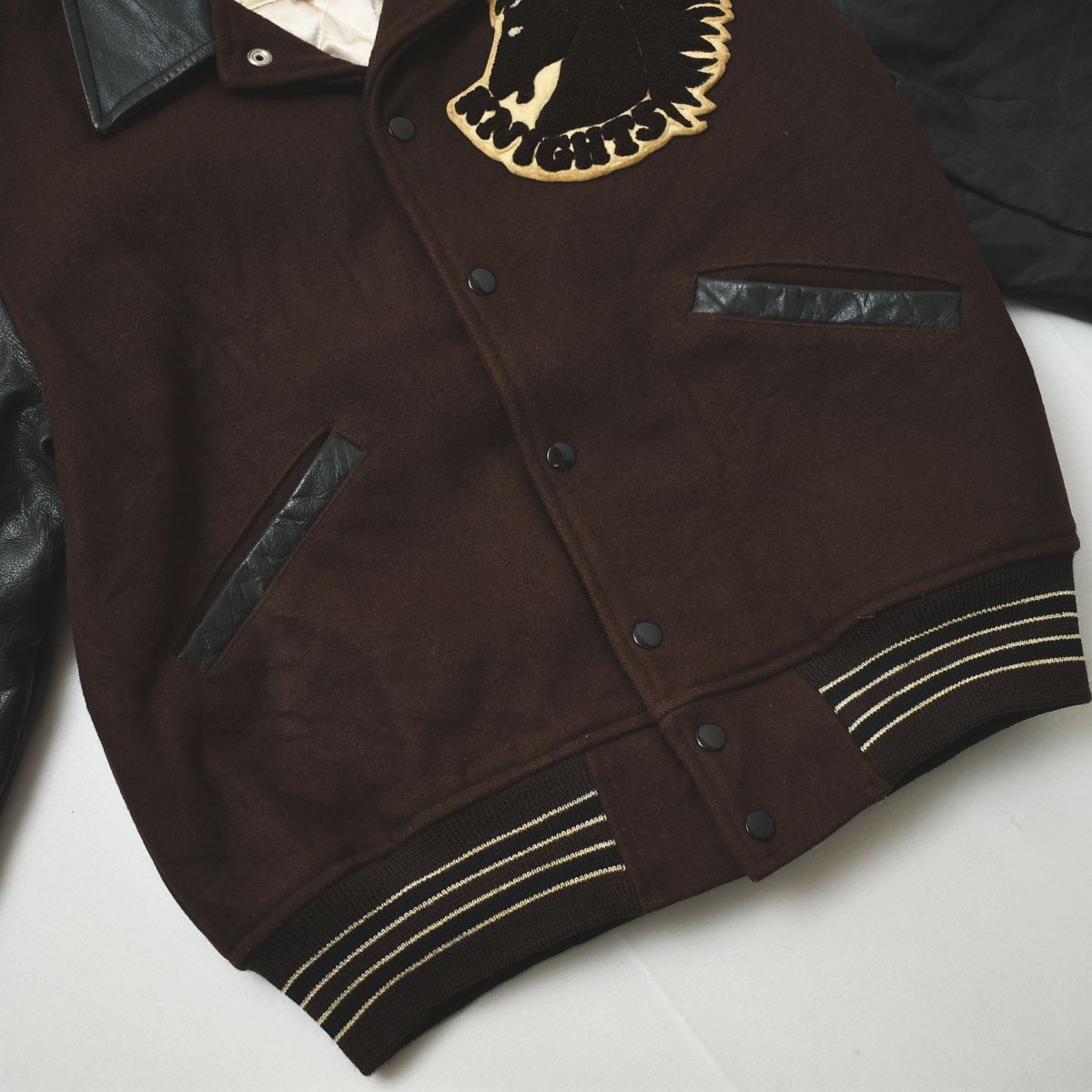 90sヴィンテージ デビットワークショップ DW 明治大学 Knights DW DAVID WORKEHOP 本革 レザー切替 スタジャン ジャンパー ジャケット L 茶 x 黒 WWW_NICORILABO_COM