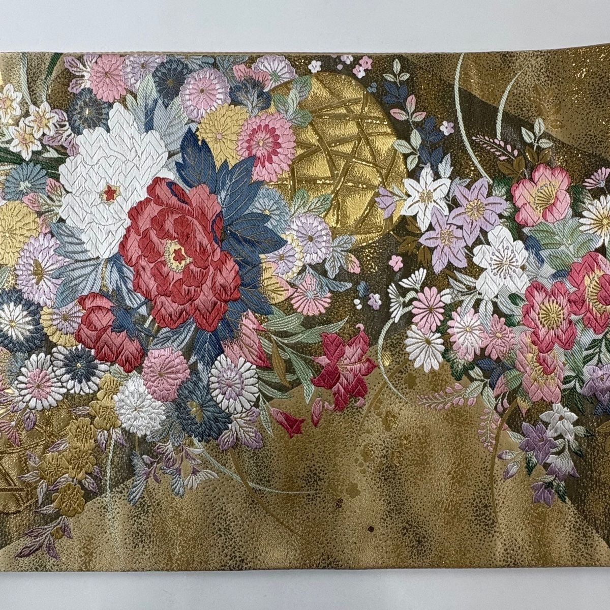 袋帯 蜀江文 草花 相良刺繍 金糸 ベージュ 六通 正絹