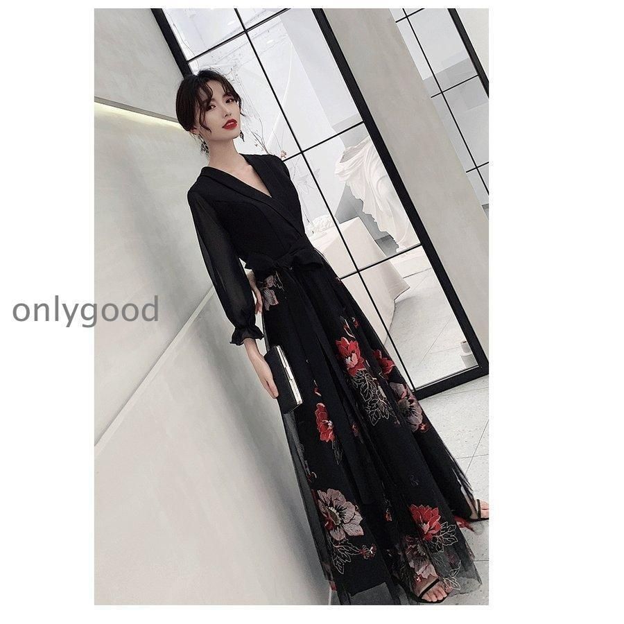 おしゃれパーティードレス ドレス カジュアルドレス イブニングドレス ロング Aライン 袖あり 長袖 シースルー シフォン Vネック 花柄の検索結果