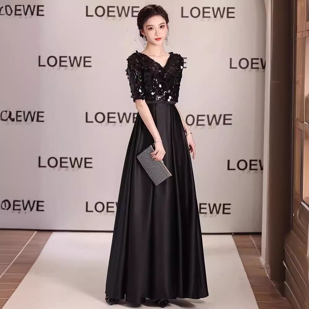 レディース 夏用 エレガント ブラック ロングドレス パーティー ワンピース 披露宴 舞台 成人式 結婚式 演奏会 謝恩会 ss