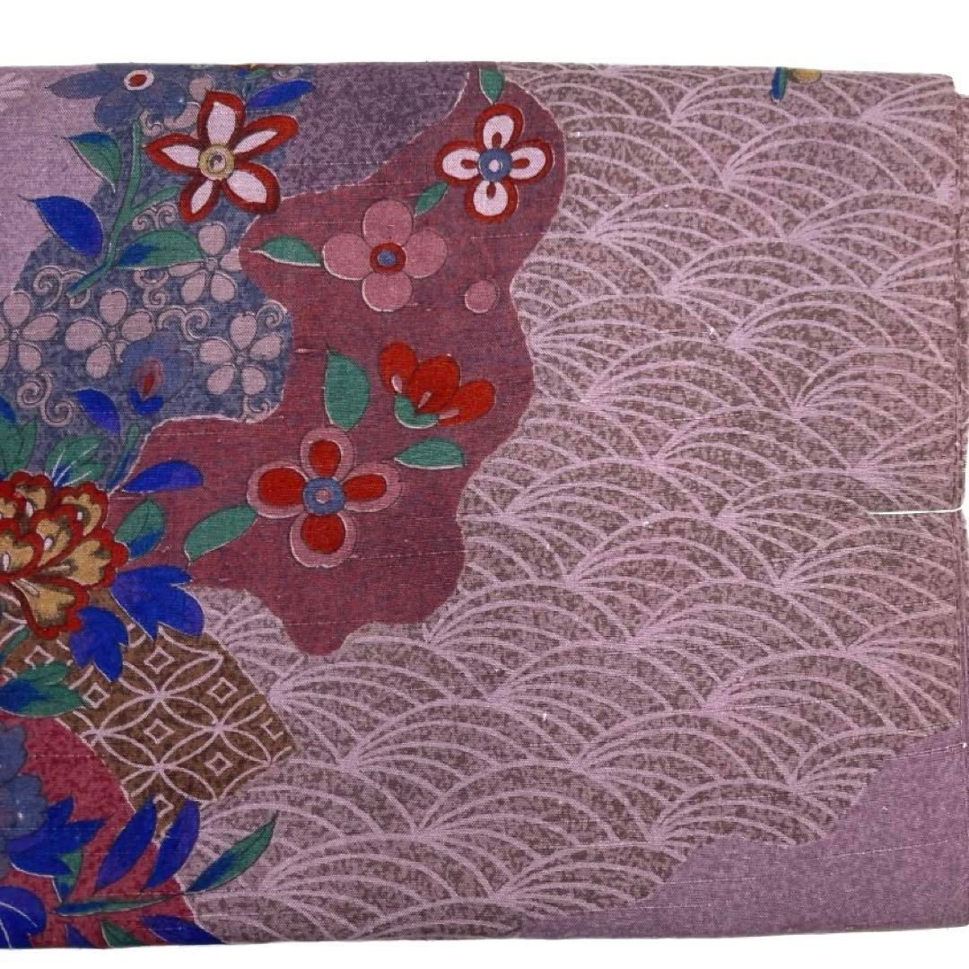 くすみのパープルの地に道長取りに扇や牡丹の文様や花模様が描かれたお洒落なデザインです。