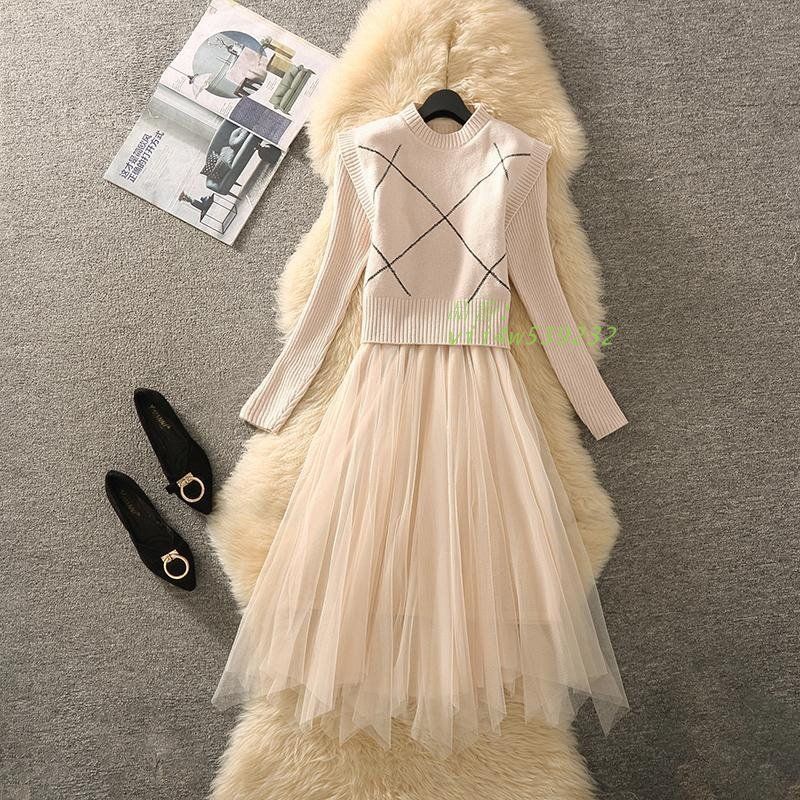 ニットワンピース チュール ベスト付き ワンピース ニット ロング クルーネック きれいめ Vネック 冬 フェミニン 長袖 大人 2点セット ハイウエスト かわいい vii4w539232 WWW_NICORILABO_COM