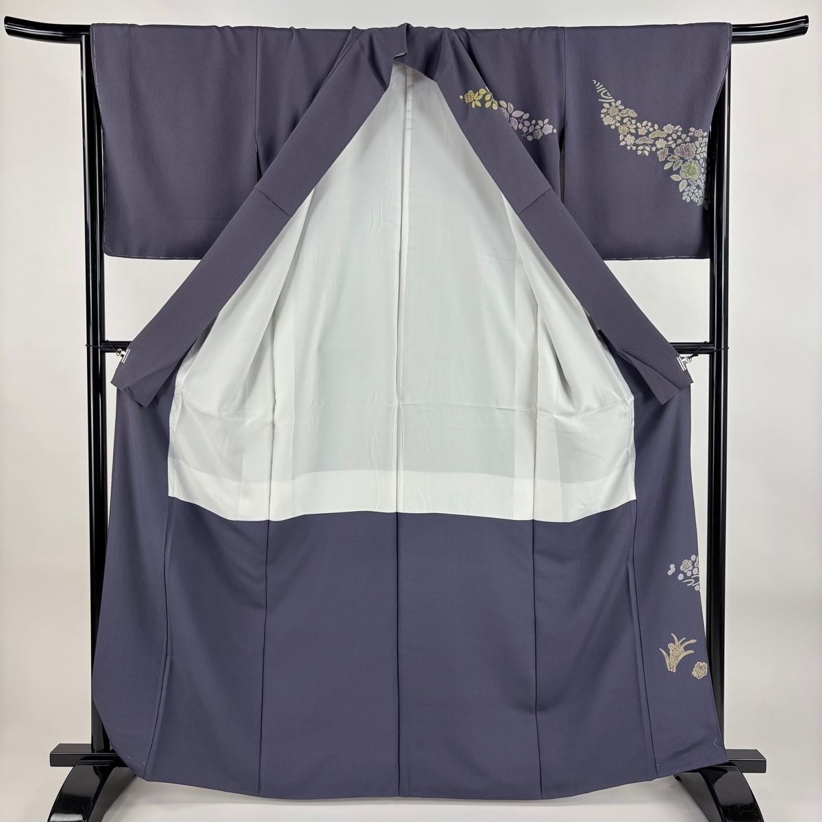 付下げ 身丈166.5cm 裄丈64.5cm M 単衣 紬地 雪輪 花 絞り 灰紫 正絹 秀品