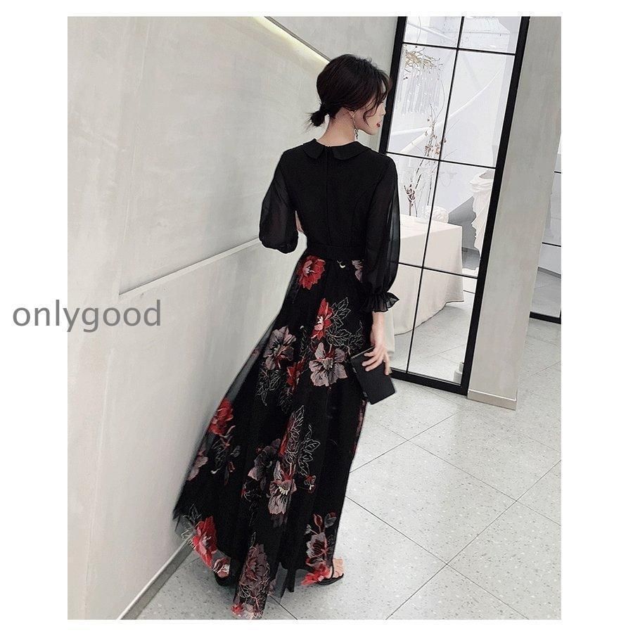 おしゃれパーティードレス ドレス カジュアルドレス イブニングドレス ロング Aライン 袖あり 長袖 シースルー シフォン Vネック 花柄 WWW_NICORILABO_COM