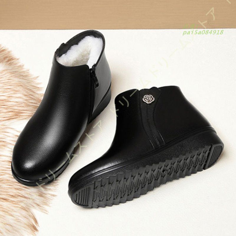 ショートブーツ レディース ボア 秋冬 裏起毛 トンブーツ 厚底 サイド 牛革 柔らかい 紐なし 足が疲れない 大きいサイズ 黒 kni5a557228