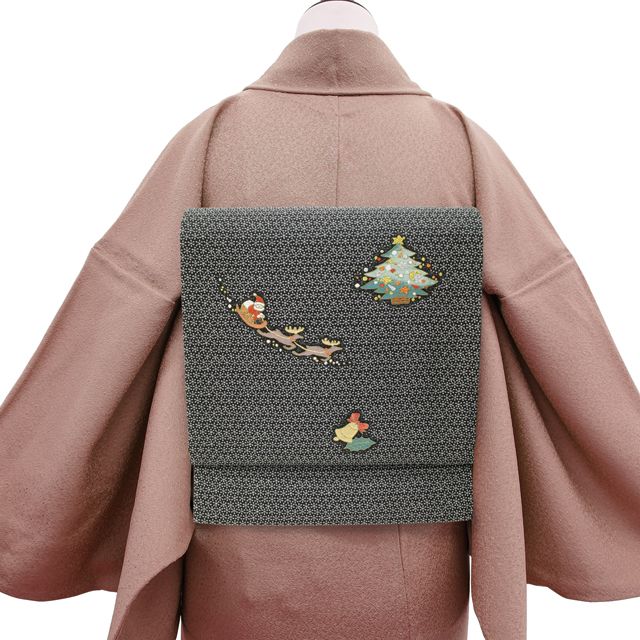 名古屋帯 リサイクル 九寸 正絹 黒地 ブラック メリークリスマス サンタクロース クリスマスツリー ベル 柊 雪の結晶 金銀糸 かわいい お洒落 お太鼓柄 カジュアル 冬 仕立て上がり みやがわ sb54600 WWW_NICORILABO_COM