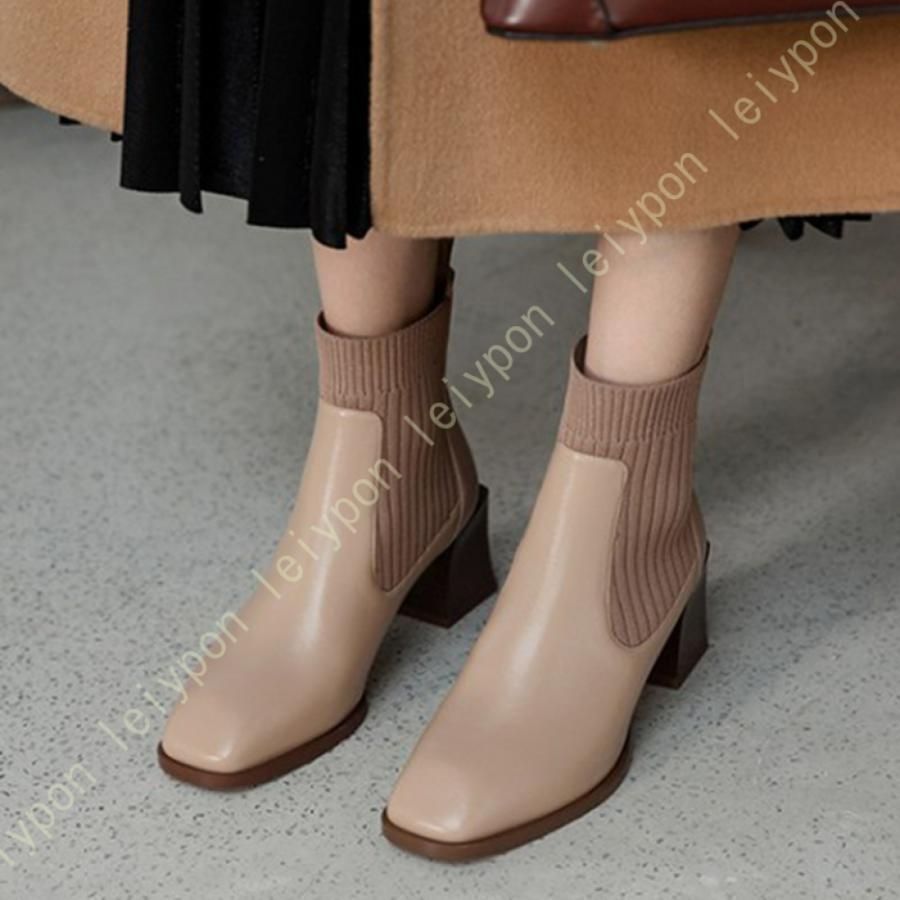 ショートブーツ レディース ブーツ ハイヒール スクエアトゥ チャンキーヒール 太ヒール ニットブーツ ソックスブーツ ミドル丈 ミディアム ミドル 秋冬 本革 WWW_NICORILABO_COM