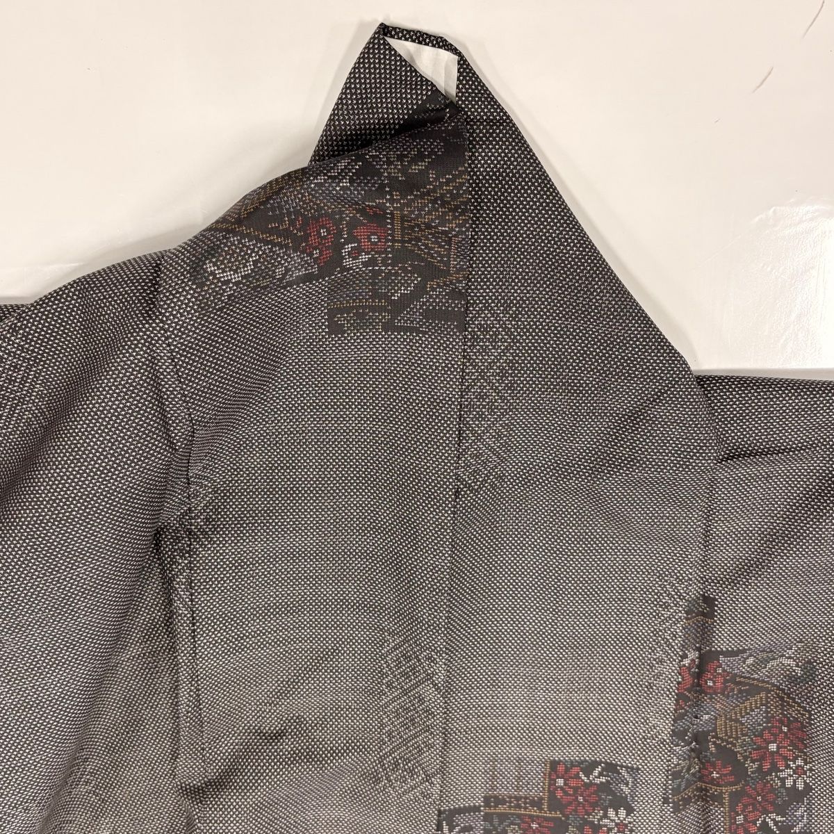 紬 身丈155cm 裄丈64cm M 袷 草花 家屋 黒灰 正絹 秀品の検索結果