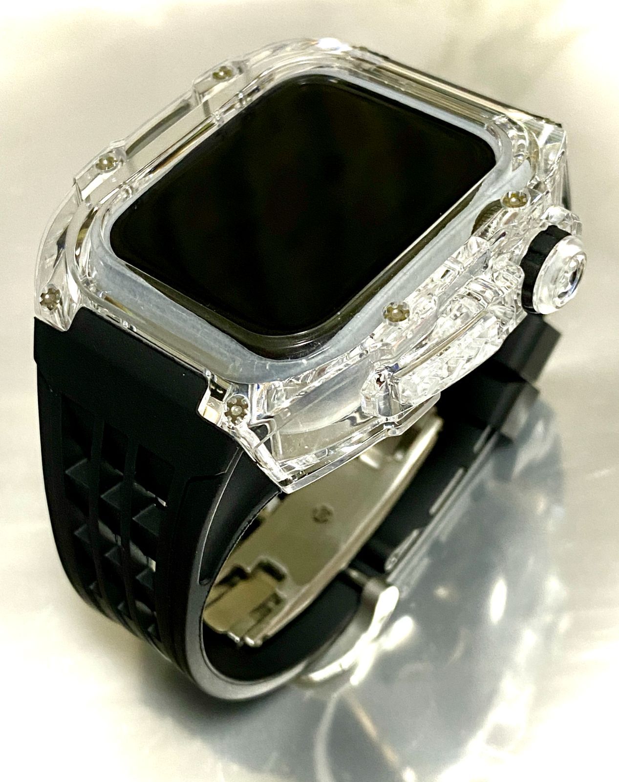 45mm用 クリア-シルバー アップルウォッチバンド ラバーベルト カバー Apple Watch クリア ケース 4 5 6 7 8 9 se スポーツ メンズ レディース
