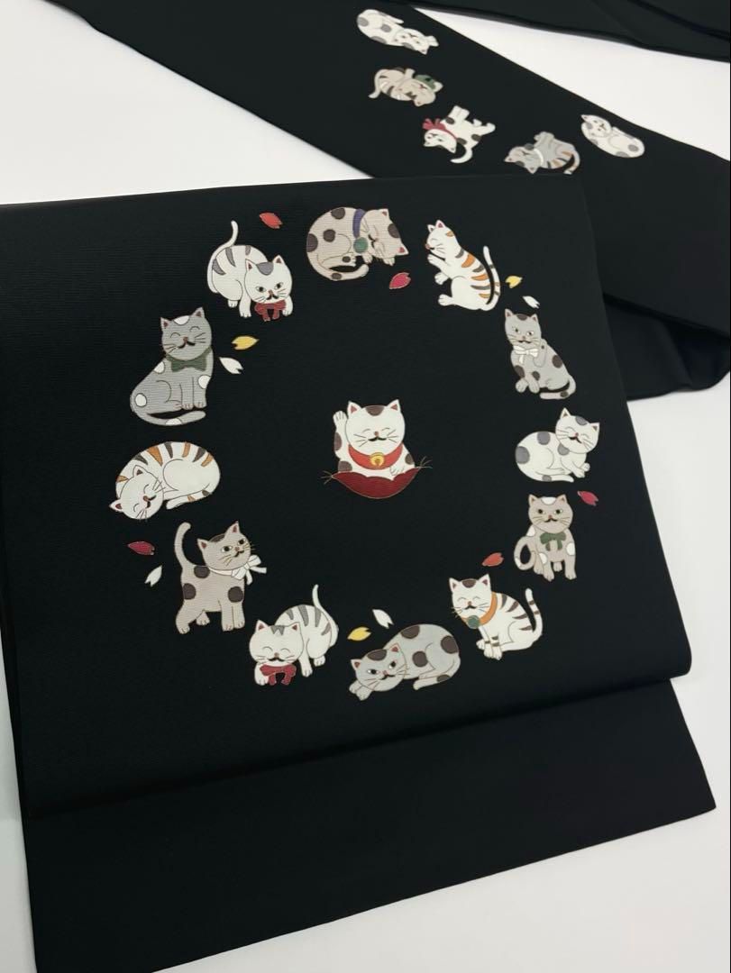 手描き 塩瀬 染帯 九寸名古屋帯 招き猫 金彩 正絹 黒地の検索結果