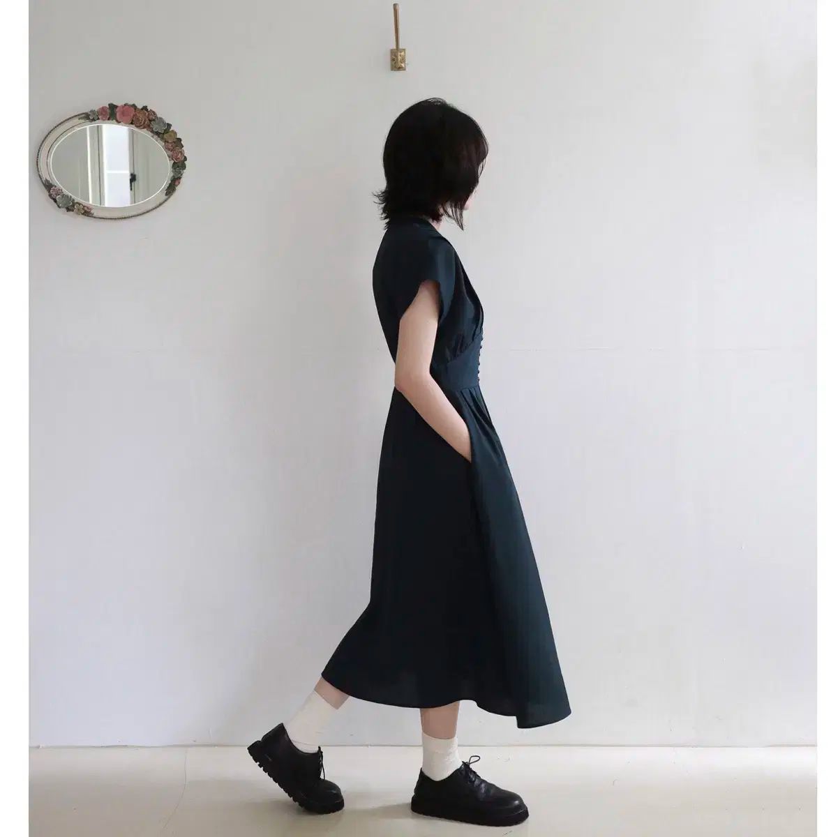 ティッカ TICCA リネンツイストスリーブワンピース ミモレ ロング 七分袖 バンドカラー ワンカラー F 黒 ブラック 0221407308 |BB