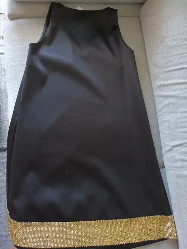 光沢のある黒のドレスに最後にゴールドビーズがアクセントになった豪華なドレスです。
