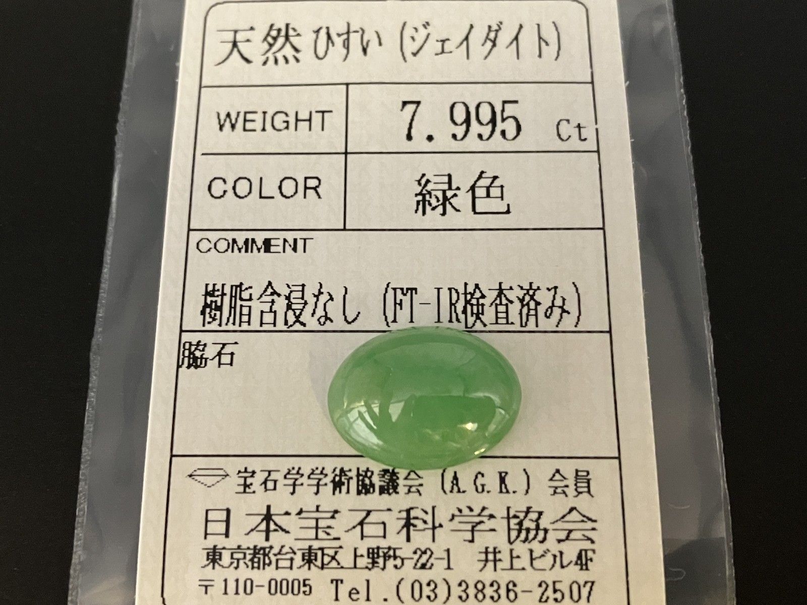 ひすい ヒスイ 翡翠 天然 7.995ct 宝石ソーティング付き 15.2㎜×11.3㎜×5.3㎜ ルース 裸石 6879YYの検索結果