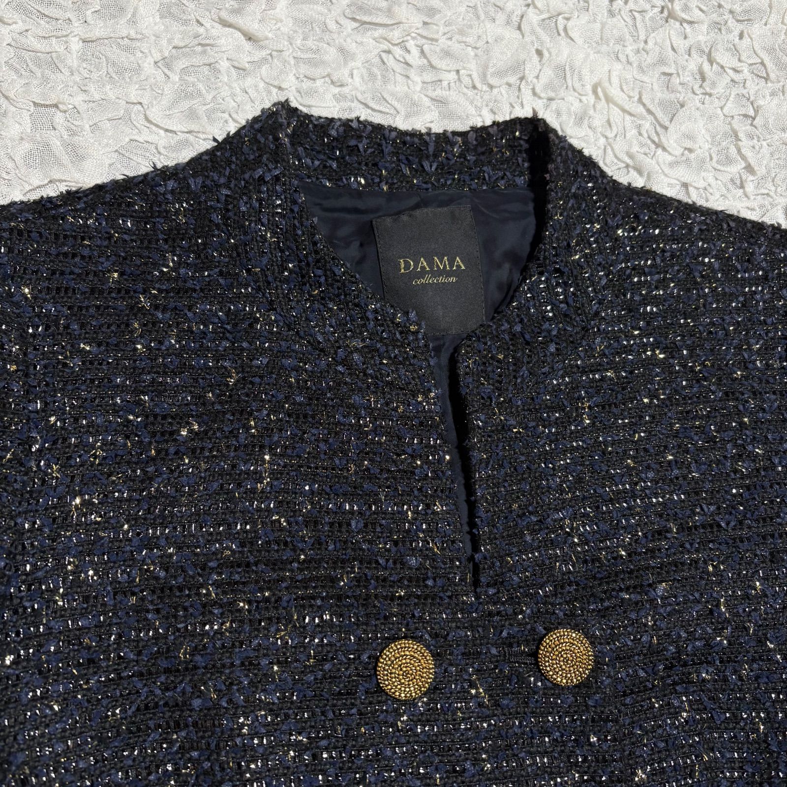 DAMA collection ダーマコレクション ラメ ツイード ダブル ジャケット 金ボタン スキッパー デザイン フ ノーカラー M ネイビー *フォロー割対象品 5%offさせて頂きます WWW_NICORILABO_COM