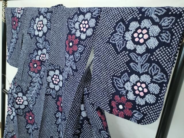 浴衣 身丈153cm 裄丈63cm S 絞り浴衣 花 幾何学 紺色 綿 名品