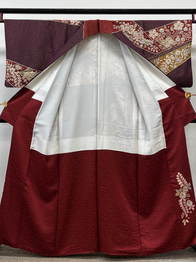 訪問着 身丈161cm 裄丈68cm L 袷 秋草 霞 金彩 ぼかし 赤茶 正絹 秀品