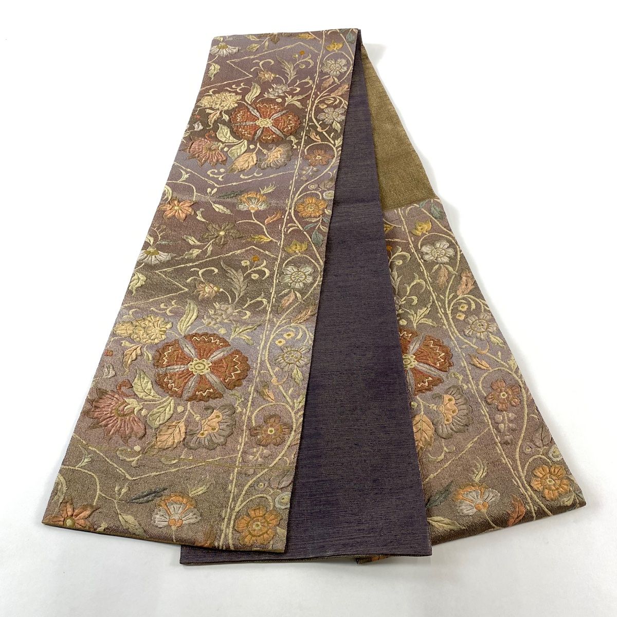 袋帯 秀品 関西仕立て 花唐草 幾何学模様 金糸 ぼかし 茶紫 六通 正絹の検索結果
