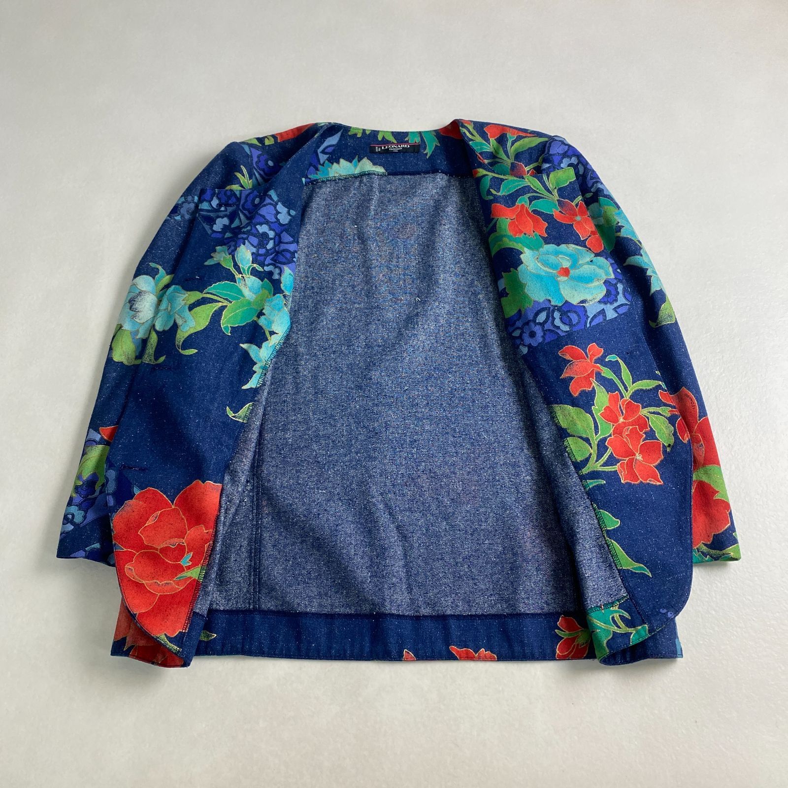 LEONARD ノーカラージャケット デニム 花柄 金ボタン XL レオナール シルク 13号の検索結果