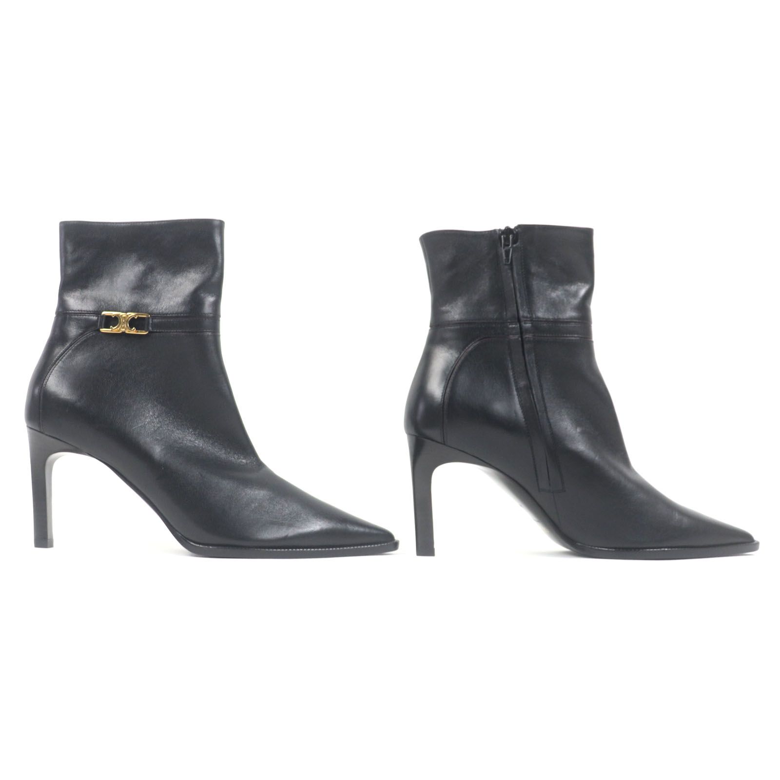 CELINE セリーヌ トリオンフ ベルヌイユ アンクルブーツ ポインテッドトゥ レザー ブーツ ブラック ゴールド金具 38 保存袋付き イタリア製 レディース WWW_NICORILABO_COM