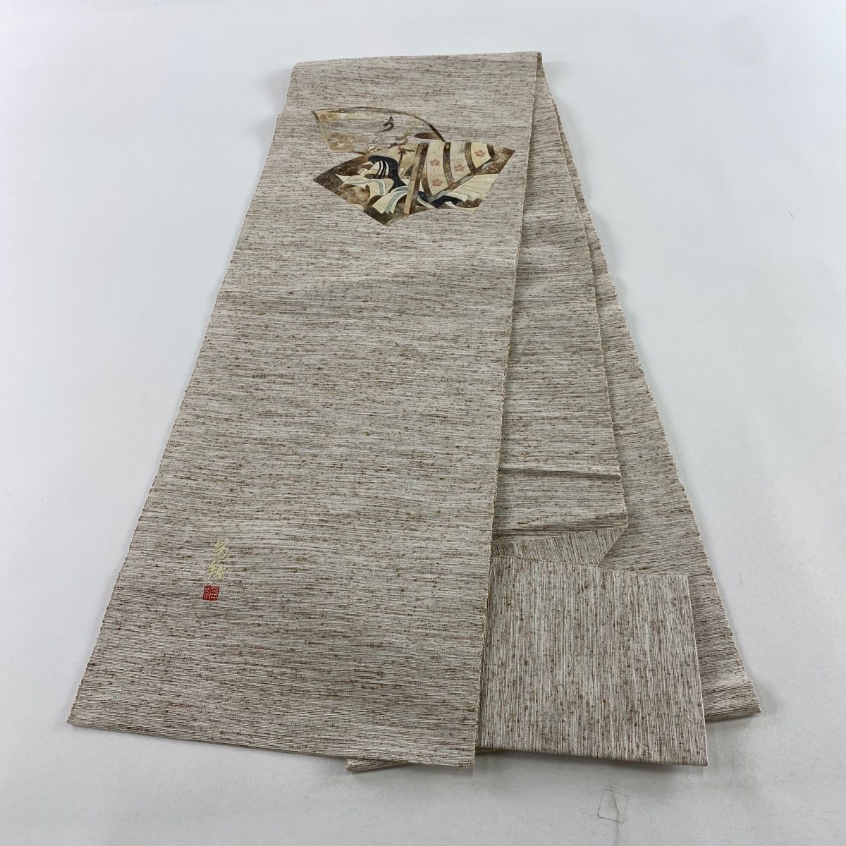 名古屋帯 名品 田尾笛秋 八寸名古屋帯 松葉仕立て 紬地 扇面 姫 薄茶色 正絹 WWW_NICORILABO_COM