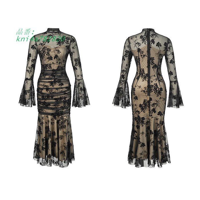 ベルスリーブ刺繍長袖 シースルーロングタイトワンピース 黒 結婚式 お呼ばれ パーティー 韓国 ドレス きれいめ おしゃれ kni4a782820 WWW_NICORILABO_COM