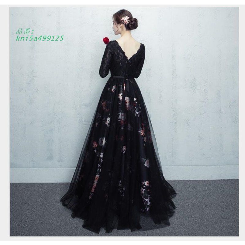 ドレス 大人 ピアノ 発表会 ロングドレス 小さいサイズ 結婚式 演奏会 レディース 母親 長袖 披露宴 袖付き 演奏会用ドレス ロング黒 pai5a102037