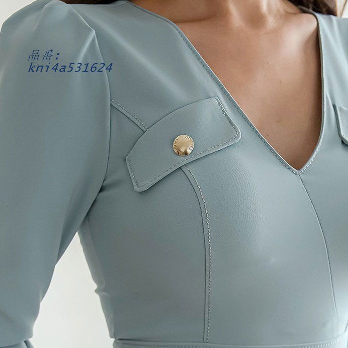 Vネック胸元開き 2連前ボタン 五分袖膝丈タイトワンピース ピンク 水色 セクシー キャバ スナック ドレス パーティー 韓国 kni4a531624 WWW_NICORILABO_COM