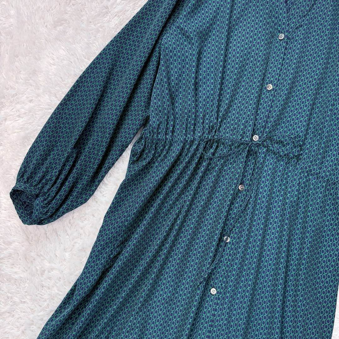 SOEJU ソージュ 日本製 チェーン柄ワンピース ネイビー グリーン スキッパー 長袖 シャツ F フリーサイズ 定価約2万 ロング丈 総柄 WWW_NICORILABO_COM