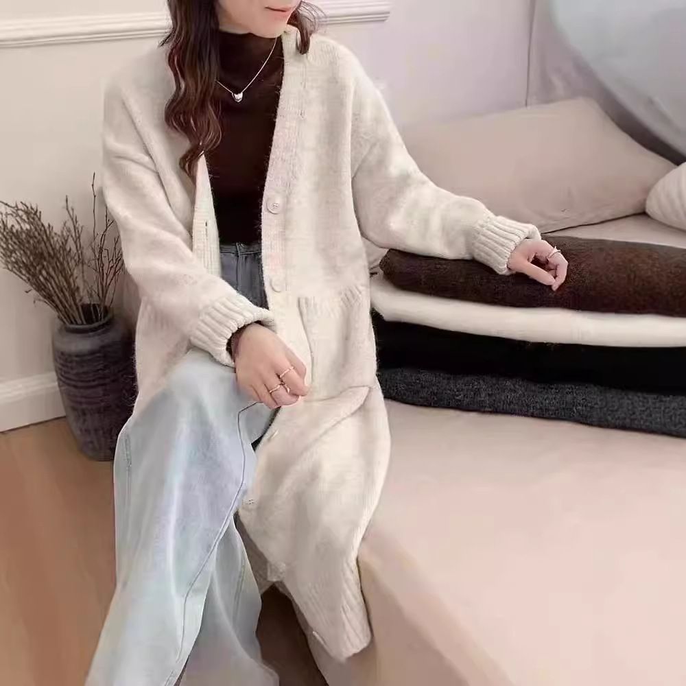 ニットカーディガン レディース ロング丈 韓国 ロングカーディガン Vネック ゆったり 長め カジュアル ワントーン 無地 ミモレ丈 シンプル kni5a148864