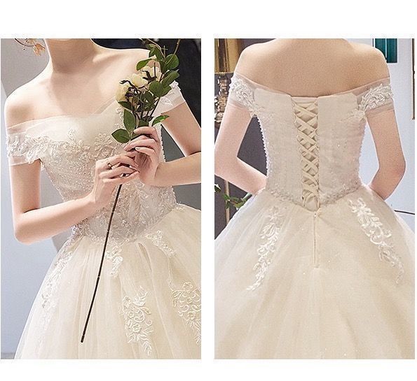 送料無料 夏 一字肩×法式サテン婚 !-利用不可文字-! 気品漂うシンプル宮廷スタイル トレーン付きウェディングドレス|8.12LYC680夏の新生活